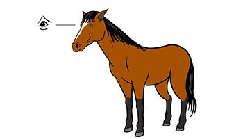 The horse is standing with raised head, ears held back or pointing in different directions, eyes open with tense muscles above the eye making an upside-down V-shape (see inset), tense muzzle with square nostrils, tense cheek muscles; they may also be sweating. The horse may be anxious or in pain.
